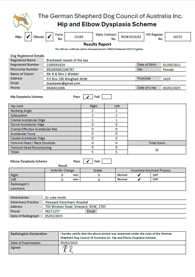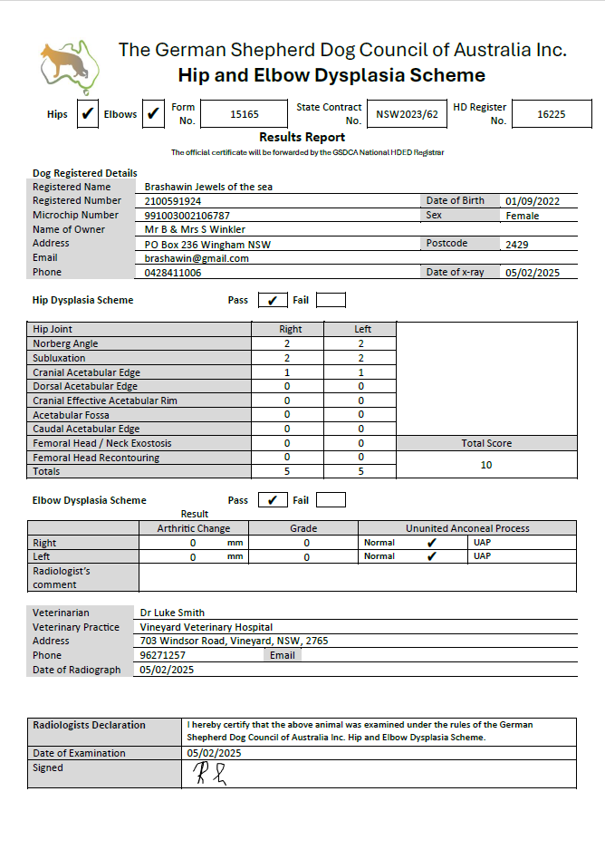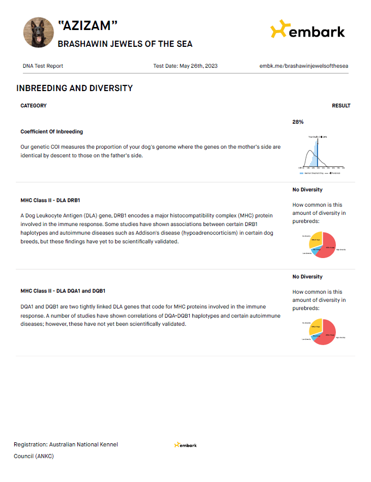 Azizam is tested for all breed relevant issues, her health clearances are listed below, her hips and elbows were scored according to GSDCA scheme, scoring A Z. She is clear for all genetic diseases including; MDR1, DM and vWD.